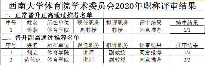 根据《英国上市公司365关于开展2020年专业技术职务申报工作的通知》和《关于2020年专业技术职务学术评审阶段有关事宜的通知》要求,经个人申报、学校审查、学院学术委员会推荐评审等程序,现将体育学院学术委员会2020年职称评审结果公示如下: