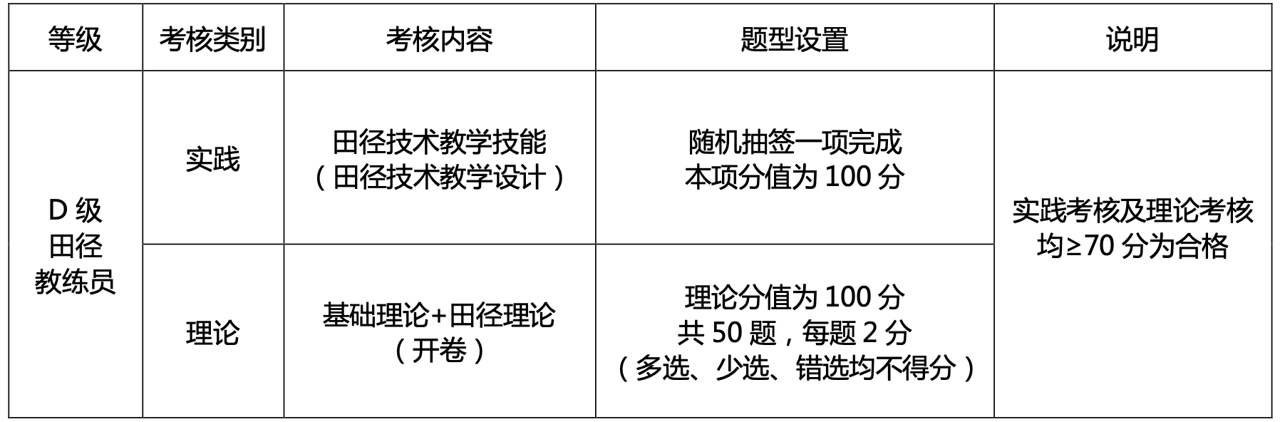D级田径教练员考核内容分为实践考核和理论考核两项。实践考核为田径技术教学展示;理论考核为笔试,考核内容为基础理论和田径理论。